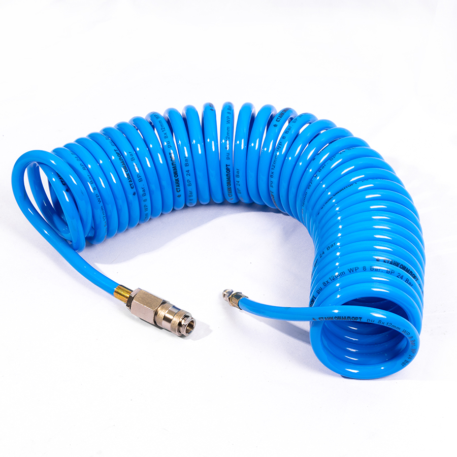 Шланг воздушный спиральный применяется для подачи воздуха от компрессора или линии сжатого воздуха к пневмоинструменту. За счет своей формы в виде спирали, шланг имеет достаточно компактный размер и не мешается под ногами.