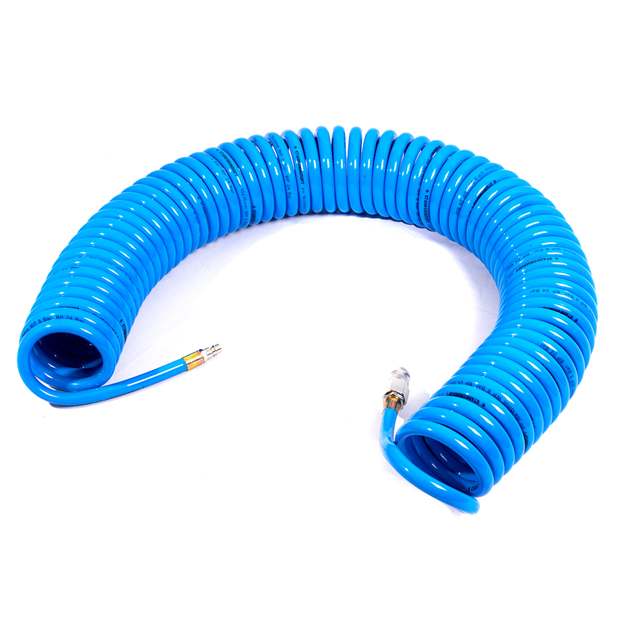 Шланг воздушный спиральный применяется для подачи воздуха от компрессора или линии сжатого воздуха к пневмоинструменту. За счет своей формы в виде спирали, шланг имеет достаточно компактный размер и не мешается под ногами.