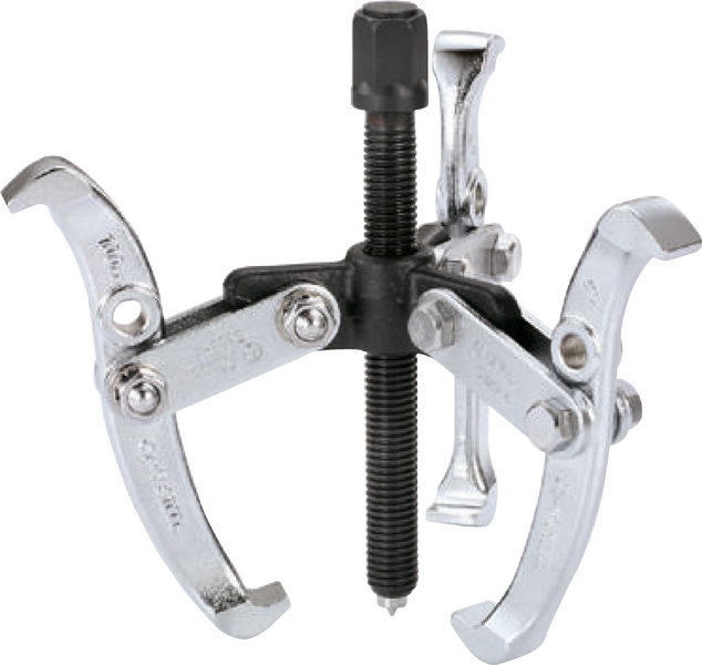 Универсальный съемник с тремя поворотными захватами за счет дополнительного захвата, в отличии от съемника с двумя захватами, позволяющий более равномерно распределять нагрузки на демонтируемую деталь и, соответственно, прилагать большее усилие. Захваты изготовлены из хромованадиевой стали путем ковки. Ходовой винт изготовлен из хромомолибденовой стали.